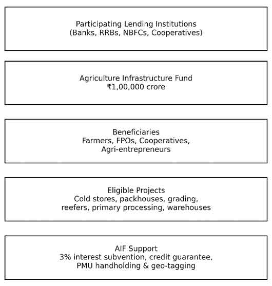 - Increased farmer incomes via higher price realisation and value-addition (target 20–40% improvement in farm-gate returns for producers integrated into AIF-supported value chains).